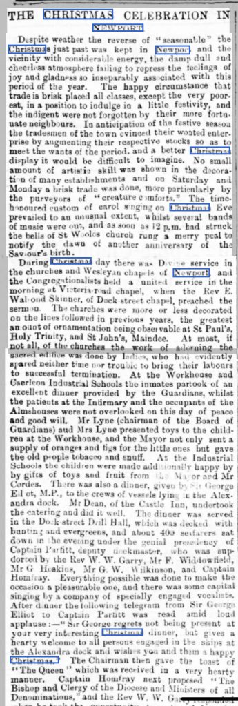 Christmas in 1860 – the Monmouthshire Merlin reported “People, however, a large proportion of whom were evidently from the country, thronged the streets on Christmas Day and probably enjoyed their cosy fireside in the evening all the better. The various places of worship were well filled. On the Mill Pond and elsewhere, skaters and sliders have had ample opportunity for displaying their agility, indulging in a healthful agreeable and exhilarating pastime. On Christmas Day at the Workhouse, the poor of the Union were regaled with roast beef and plum pudding, the result of a subscription raised for the purpose. The Master and the Matron did all within their power towards the comfort of the inmates on the occasion. In the evening a very nicely decorated Christmas tree was introduced, from the branches of which were suspended little articles of use and interest, which were distributed to the poor inmates, who were much pleased with the manner in which the Master and Matron had endeavoured to amuse them.”