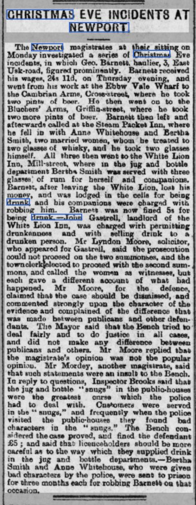 Christmas Hampers – in his Newport Kaleidoscope Alan Roderick says that in 1896 a special hamper could be purchased from a local department store for a guinea (twenty one shillings) and included an alcoholic selection of a quart of Champagne, and bottles of Port, Golden Sherry, Jamaica Rum, London Gin, Irish Whiskey and Martell Brandy.