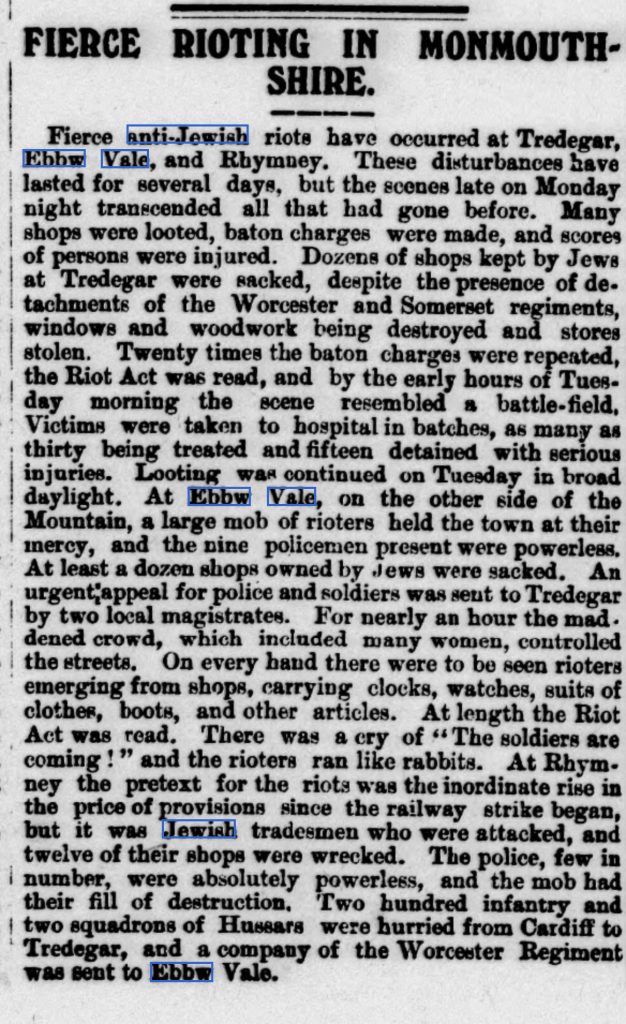 Jewish numbers in Newport and other major towns were swollen by an upsurge of unrest in the valley areas in 1911. A 10-month strike by coalminers had ended with their abject defeat – the areas were seething with unrest. Anti-Jewish riots swept the valley communities of Monmouthshire and Glamorgan in August 1911, leading to the temporary imposition of military rule – Winston Churchill ordered detachments of the Worcester Regiment to patrol the affected areas – and to the wholesale evacuation of Jewish families by special trains that conveyed them to the relative safety of Cardiff, Newport, Aberdare and Merthyr. These riots – a week-long orgy of attacks on Jewish property – began in Tredegar during the evening of Saturday, August 19, and spread rapidly to Ebbw Vale, Rhymney and other industrial centres of the Western Valleys. Wherever Jews could be found, the rioters struck.
