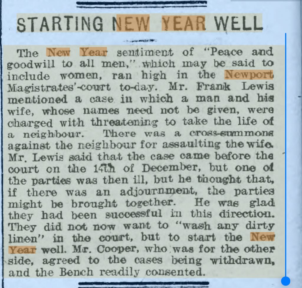Traditional sporting fixtures in rugby and football were a feature of the period. Newport RFC often played away over the new year period playing match against Plymouth Devonport and Exeter. Other fixtures against Llanelli and London Welsh also figured. Newport played away at London Welsh on New Year’s Eve at Queen’s Park, Kensington winning 12-4. Newport County were often paired with Swindon or Cardiff in the holiday period.