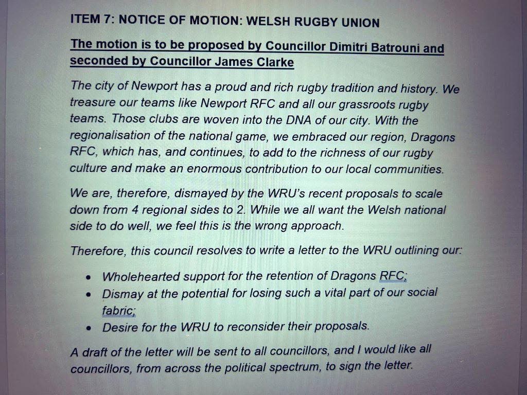 Batrouni said on Facebook “Important we unite as a city & clearly stand against WRU’s proposal to cut the number of regions from 4 to 2. I’ve already made our position clear, but I hope all cllrs from across the political spectrum support the motion below and sign the letter to the WRU”.