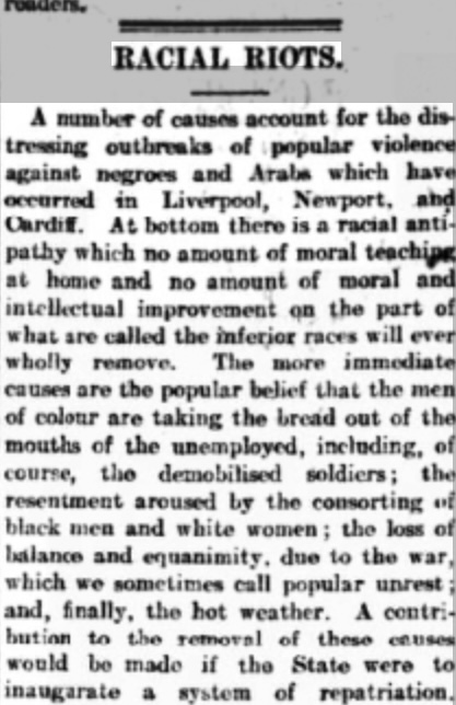 Race riots in Britain did not start in the 1950s, similar set of riots occurred years ago in 1919 across Britain, when tension between white locals, police and the new black communities reached breaking point. The new communities were concentrated in Glasgow, Liverpool, Cardiff, Barry and Newport.